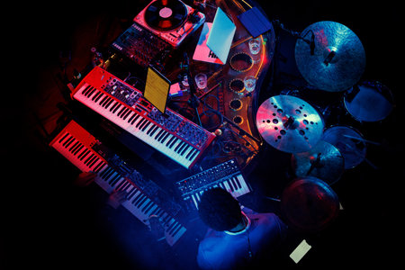 Musical instruments. Performances of musicians. Drum kit. Saxophone. Electronic piano. Preparing for the concert. Music background.