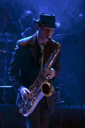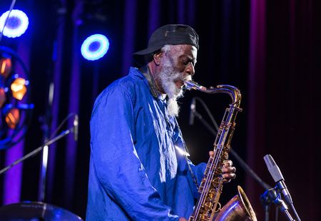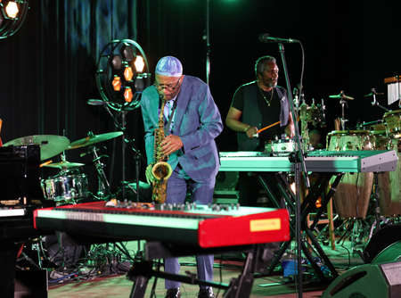 Cracow, Poland - July 12, 2018: Icon of world jazz - Pharoah Sanders the Icon Quartetet live on stage of Kijow.Centre at the Summer Jazz Festival in Krakow. Poland