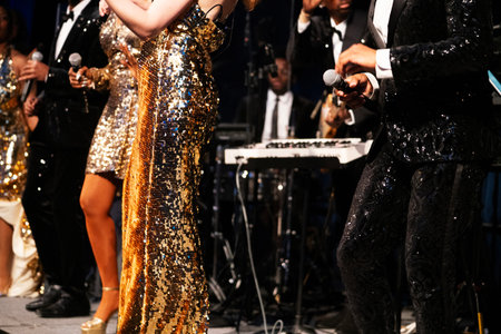 Concert view of violoncello player with vocalist and musical orchestra band, during jazz concert, performing music, violoncellist cello jazz player on stage, old retro vintage contrabass