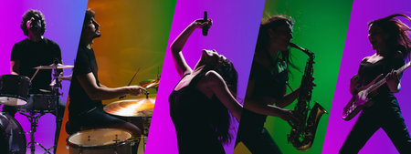 Artistic young people, men and women performing on concert, singing, playing drums over multicolored background in neon light. Collage. Concept of human emotion, music, youth, fun and joy