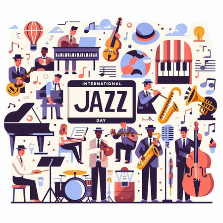 April 30 Jazz Day web template illustration of funny music band instruments. Includes trumpet, saxophone, piano and drum in retro mid century cartoon style.