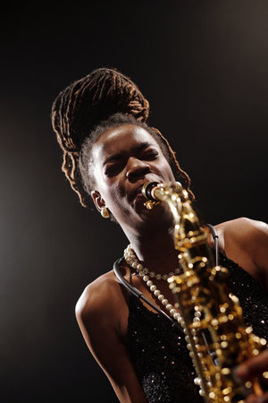 African American female musician playing saxophone on stage, wearing jewelry, eyes closed, focusing on music performance, close up of face and instrument, jazz musician context