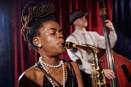 Black young adult woman playing saxophone with eyes closed in foreground, Caucasian young adult man playing double bass in background, both performing as jazz musicians on stage
