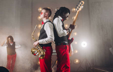 Musicians playing jazz illustration. Group of characters perform jazz music on saxophones and double bass classical blues concert performance in vector nightclub.