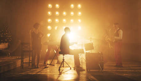 Performance of a rock band at a concert or party. Silhouettes of musicians, guitarist and drummer. People dance to the music, the light from the spotlights