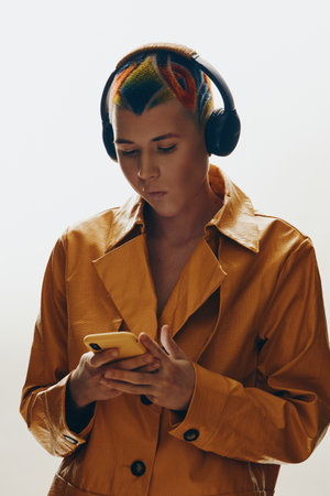 Young woman with colorful dyed hair wearing headphones and a brown jacket focused on her smartphone, isolated on white background, modern urban style.