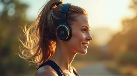 Young woman enjoying music with headphones on a sunny day outdoors