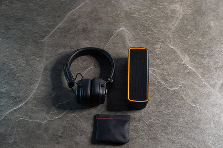 Moscow, Russia - October 04, 2019: orange wireless overhead monitor headphones JBL Tune lie on a dark foam rubber noise canceling panel. close-up soft focus, blur background