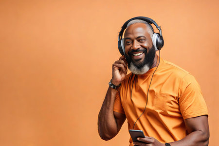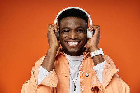 Handsome African American man in stylish attire, smiling while wearing headphones on orange background.