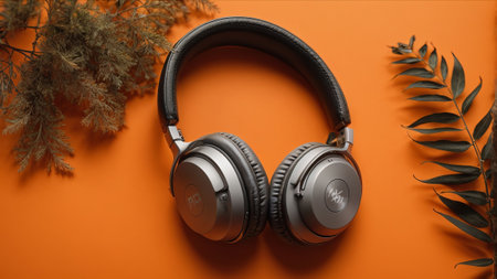 Stylish headphones on orange background, top view. Space for text