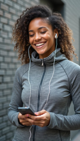 Smiling woman enjoying music on her smartphone