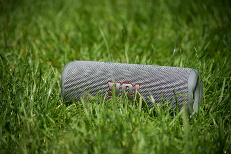 Mulhouse - France - 16 June 2022 - Closeup of grey portable JBL subwoofer speaker on the grass in a public garden