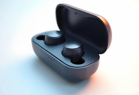 Two wireless earbuds rest inside a compact charging case, elegantly illuminated by soft light, showcasing modern design and functionality. Perfect for music lovers on the go.