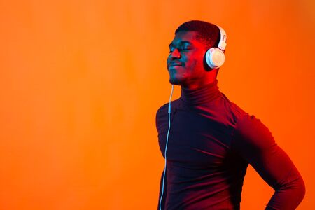 Young african-american mans listening to music in headphones in neon light with copy space. Male portrait. Concept of human emotions, facial expression, holidays or weekend, hobby,