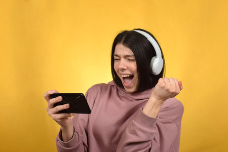 Excited young Asian woman using mobile phone and headphones on yellow background