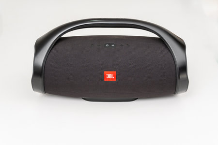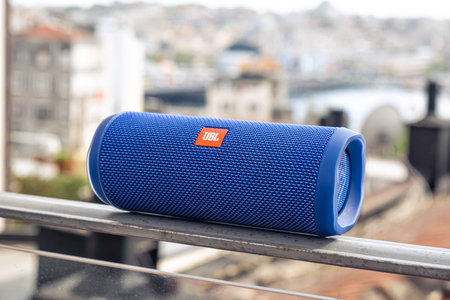 ISTANBUL, TURKEY - May, 2021: JBL Bluetooth music speaker outdoor marco close up