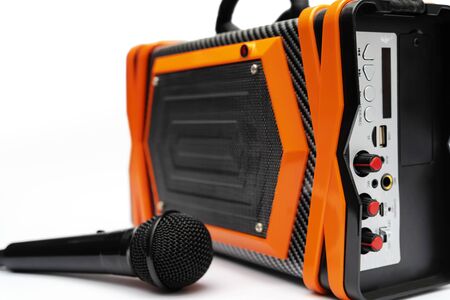Modern radio, orange, black, with a black microphone. Wireless hi-tech electronic mass media equipment, White background