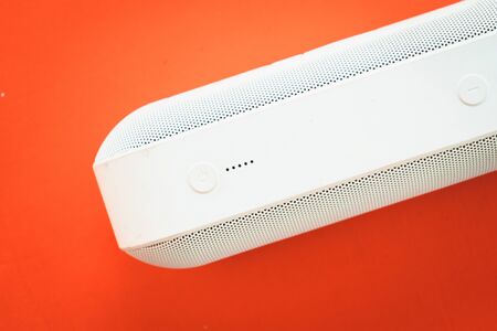 Wireless music column. Red control and volume buttons on gray speaker. Wallpaper and background.