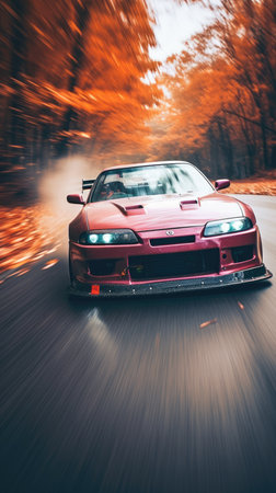 high speed drift car sliding through a sharp turn on a night racetrack with smoke and motion blur