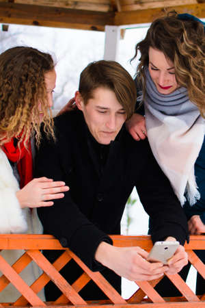Phone. Close up of a group of young people with smartphones. Fri