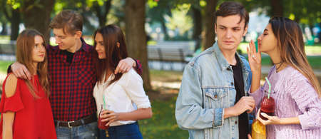 Jealousy and envy in friends relationship. Cheerful young people with detox cocktail having outdoor summer party
