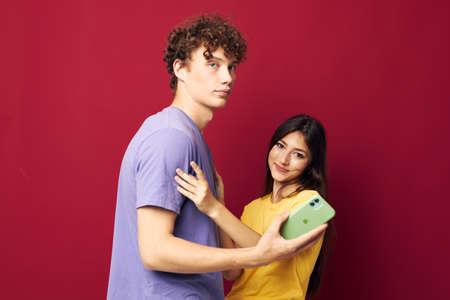 nice guy and girl in colorful T-shirts with a phone red background