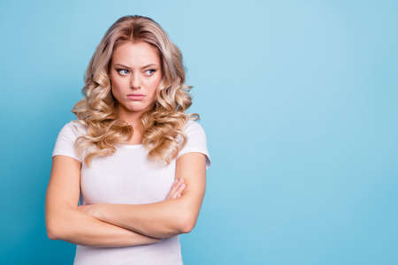 Close up photo beautiful her she lady hands arms crossed not tell speak talk look empty space your fault expression wear casual white t-shirt jeans denim clothes outfit isolated bright blue background