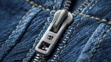 A detailed close-up image of a silver zipper on denim fabric highlights the craftsmanship and texture, perfect for fashion-related projects.