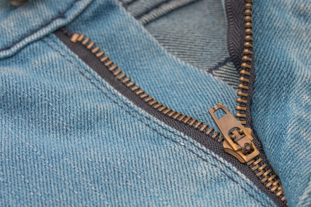 Blue jeans with zipper close up. Selective focus and shallow depth of field
