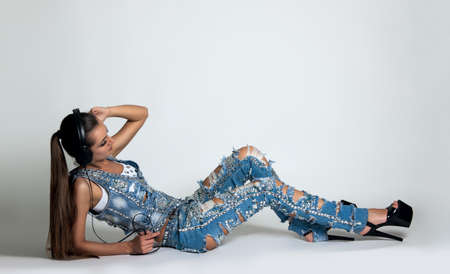Beautiful girl with headphones. girl in denim clothes lying on the floor. Torn jeans. Rhinestones.