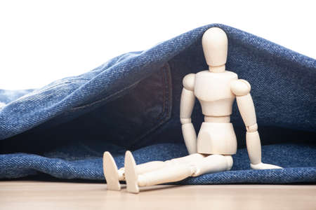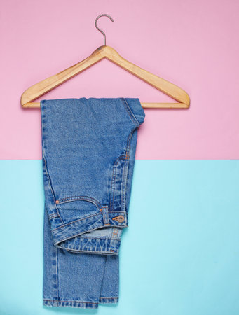 Top view, flat lay blue jeans with a wooden hanger on a pastel background. Minimalism