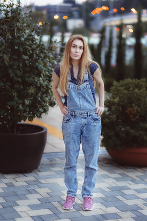 A long-haired woman in denim overalls stands on a granite tiled sidewalk near decorative potted bushes on a dusky evening.