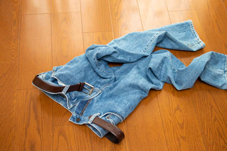 A casual flat lay display featuring blue jeans and a light fabric shirt on a minimalist surface. Perfect for fashion and lifestyle projects.