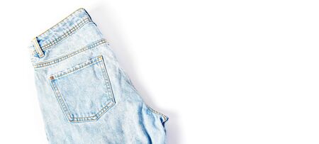 folded blue jeans on a white background. modern casual clothing. flat lay, copy space
