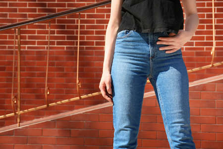 Close up macro view of the female blue jeans shirt size clothing label with copy space for fashion background