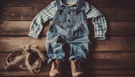 Denim clad men sit on wood flooring, wearing fashionable jeans generated by artificial intelligence