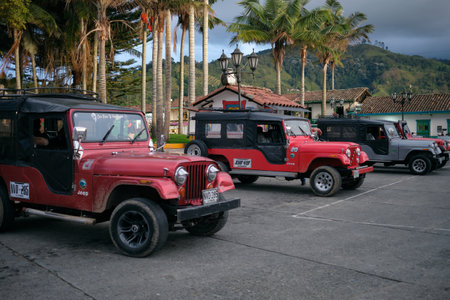 SALENTO, COLOMBIA - JULY 2021. Traditional Jeeps Willy parked at the main square of the beautiful small town of Filandia in Colombia.