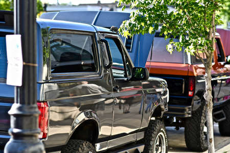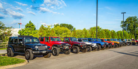 Pigeon Forge, TN - August 25, 2017: Modified Off Road Jeep Wranglers parked in a row at a local enthusiast rally.