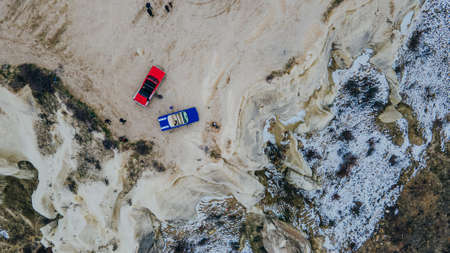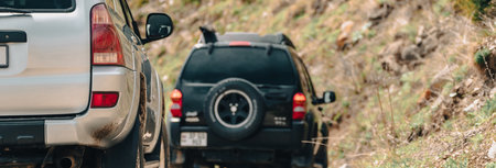 Pair of two 4x4 soviet suv covertible top vehicle on dirt gravel unpaved road in summer at sunset morning sun. Off road car mountain safari adventure nature trip journey concept. ATV hunting rental