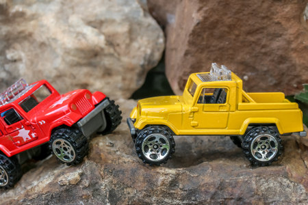 Two miniature 4x4 pickup trucks, one yellow and one red, appearing to meet on a rugged rocky path in a small-scale outdoor scene. Creative off-road adventure concept.