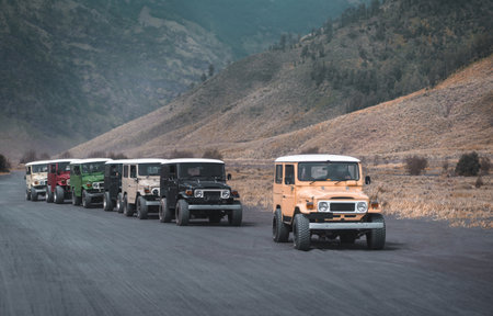 Bromo mountain travel jeeps driving in a row. Rental vehicle for discovering Semeru National park