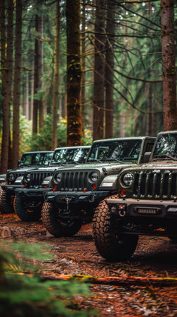 Jeep wrangler convoy in forest trail at dawn