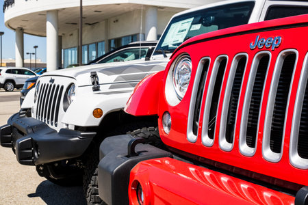 Noblesville - Circa March 2021: Jeep Wrangler display at a Chrysler dealership. The Stellantis subsidiaries of FCA are Chrysler, Dodge, Jeep, and Ram.