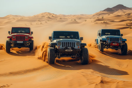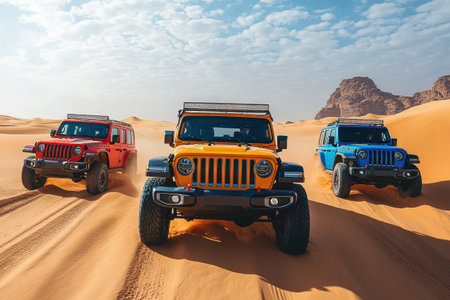 Three vibrant SUVs in red, orange, and blue are skillfully driving through golden sand dunes. The vehicles kick up dust against a backdrop of rugged rock formations and a blue sky, suggesting an exhilarating off-road experience.