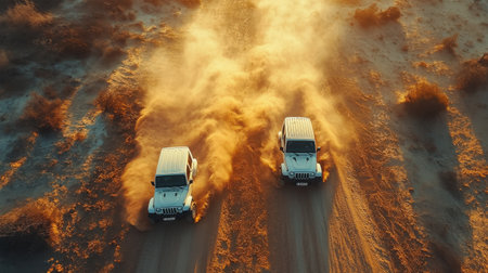 Two rugged vehicles speed through a dusty expanse, kicking up clouds of sand as they navigate the rough terrain. The warm hues of sunset cast an orange glow over the scene, creating a thrilling atmosphere.