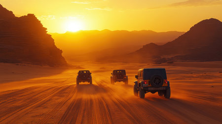 Three off-road vehicles navigate through the vast desert at sunset, kicking up clouds of sand. The golden light casts a warm glow over the dunes, enhancing the rugged beauty of the landscape.