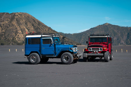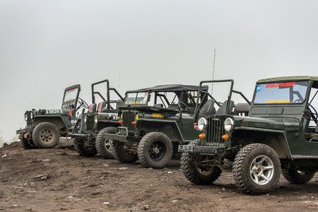 BROMO, INDONESIA - JULY 12, 2O17: Close up of many Jeeps parked in a row with the Mount Bromo in the horizont, the active mount Bromo is one of the most visited tourist attractions in East Java, Indonesia