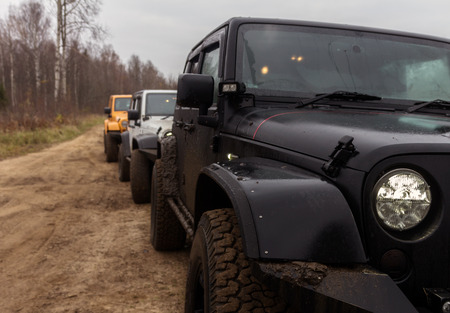 Leningrad Oblast, Russia, October 22, 2016 Offroad expedition by jeep Wrangler in the Leningrad region, the Jeep Wrangler is a compact four wheel drive off road and sport utility vehicle