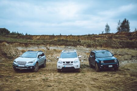 General view of 4x4 off-road vehicles built before the start of extreme competitions. Cross-country racing