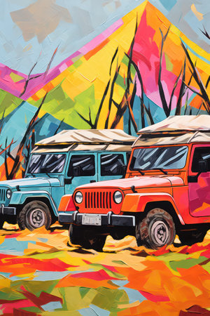Oil painting of four-wheel drive jeep on the background of autumn forest.